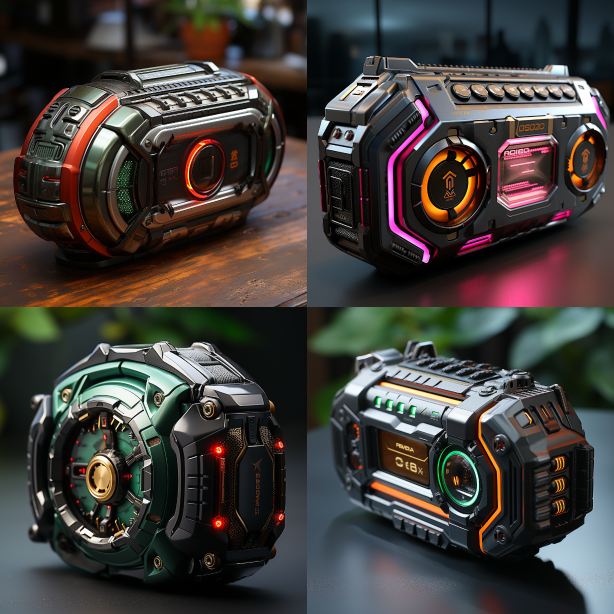 Midjourney Bot 更新时间:2023-08-30 11:45Design a Bluetooth speaker with a futuristic technology style,hyper detailed,photorealistic,3D rendering,Blender,UHD,Best quality,studio light,red and green tones,Cyberpunk 2077,Starcraft --ar 1:1 --style raw --v 5.2 --s 750