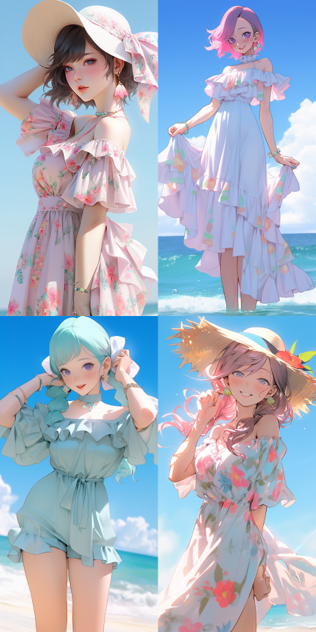 Midjourney Bot 更新时间:2023-08-30 11:40A girl wear each output which was celerity style dress, positive and full body,coastal grandmother outfit,beach outfit::2,pink hair,delicate skin texture,high resolution,half body shot,Turquoise color,sky Blue color --no background --ar 1:2 --style expressive --niji 5