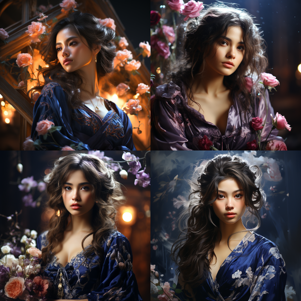 Midjourney Bot 更新时间:2023-08-30 11:25On a mysterious night in the East, a charming beauty was wearing a gorgeous purple cheongsam. Her long hair shimmered with a faint glow, like shooting stars in the dark night, adorned with a few strands of red roses and white peonies. Her eyes sparkled with deep and mysterious light, like two sapphires of deep blue. Her skin was as smooth as white jade, revealing a delicate yet resilient temperament. She gracefully walked across a lake shimmering with stars, her figure reflected on the water's surface, like a beautiful watercolor painting. In this enchanting scene, her beauty seemed to come from another dimension, captivating anyone who beheld it. --ar 1:1 --style raw --v 5.2 --s 750