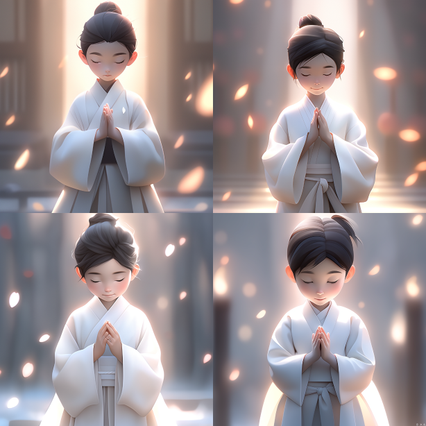 Midjourney Bot 更新时间:2023-08-30 11:27Chinese style, 7-year old boy, wearing a white robe, dressing, hands folder, light white and light silver styles, childlike, classic, carefully designed, 3D, c4d, Hyperdetail, animated lighting, defocus, perfect details, FHD, 4K, 8K --iw 1.75 --ar 1:1 --niji 5 --s 250 --style cute