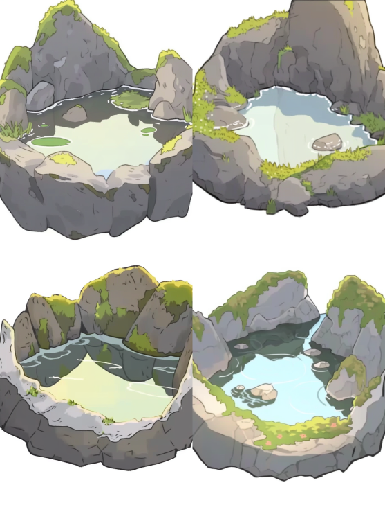 Midjourney Bot 更新时间:2023-08-30 11:30A water pond, a green pool, against a white background. Front view, with the composition centered. --no people --iw 1.25 --ar 3:4 --style expressive --niji 5 --s 750