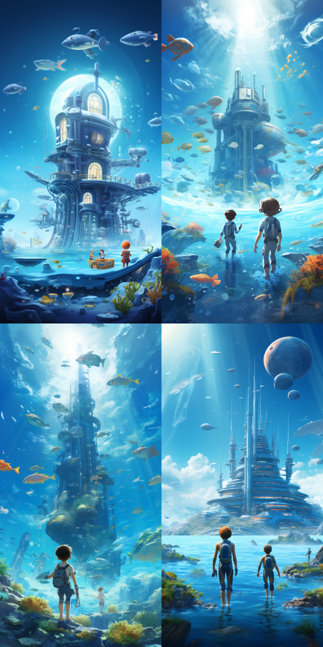 Midjourney Bot 更新时间:2023-08-30 11:27On a blue planet, children are playing in the shallow sea, and a huge spaceship skips over them --ar 1:2 --style raw --v 5.2