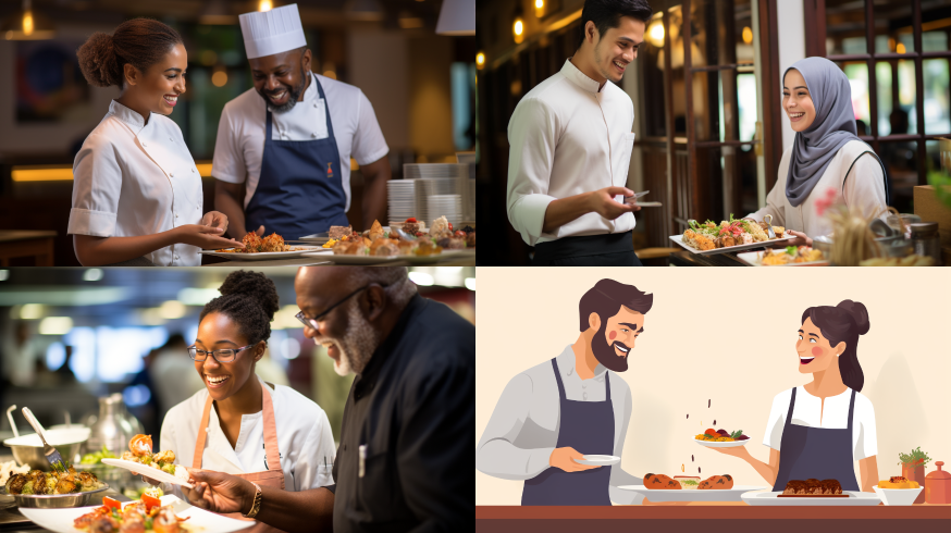 Midjourney Bot 更新时间:2023-08-30 11:32A person walked over to taste the delicious food, and the chef stood beside her happily watching. --ar 16:9 --style raw --v 5.2