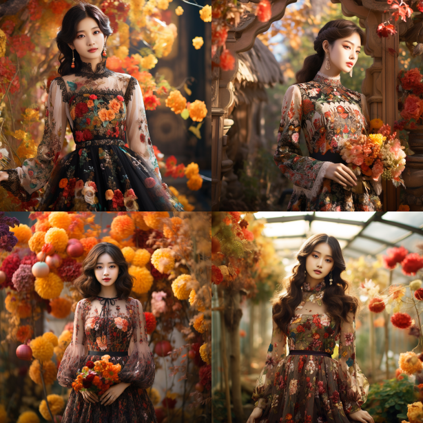 Midjourney Bot 更新时间:2023-08-30 11:27In a garden on an autumn day, a Korean girl stands gracefully amidst a vibrant array of flowers. She is wearing an exquisite sweater dress, with its intricate cut-out design exuding a unique charm. The bubble sleeves gently sway in the breeze, adding a touch of romance to the entire ensemble. The skirt cleverly incorporates mesh fabric, as if countless butterflies are dancing within it. The girl's gaze is gentle and alluring, as if she shares a special understanding with the flowers. The surrounding flowers also seem intoxicated by her beauty, transforming this scene into a captivating and mysterious painting. --ar 1:1 --style raw --v 5.2
