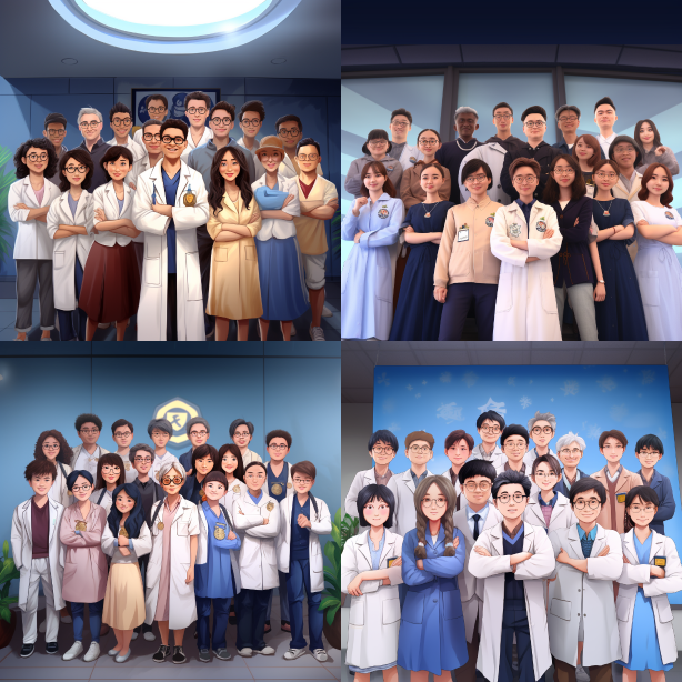 Midjourney Bot 更新时间:2023-08-30 11:28There are a total of 12 members in the photo. Please draw cartoon characters wearing white lab coats based on the characters' features in the photo, such as hairstyle, whether they wear glasses, skin color, etc. Each character should have their own unique features based on the photo. --ar 1:1 --v 5.2 --style raw