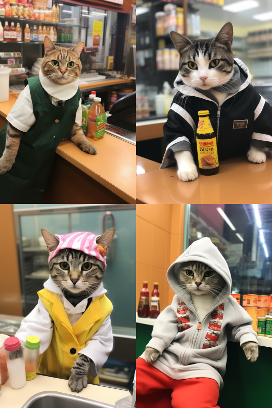 Midjourney Bot 更新时间:2023-08-30 11:25Cats wearing convenience store clothes, selling drinks at convenience stores, cats selling drinks at convenience stores --ar 2:3 --style raw --v 5.2