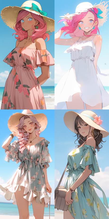 Midjourney Bot 更新时间:2023-08-30 11:33A girl wear beach output which was celebrity style dress,coastal grandmother outfit,beach outfit::2,pink hair,delicate skin texture,high resolution,half body shot,Turquoise color,sky Blue color --no background --ar 1:2 --style expressive --niji 5
