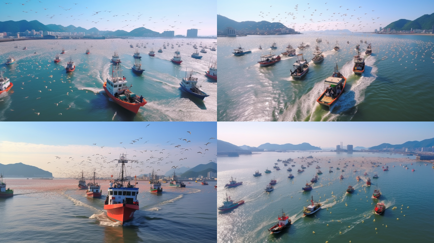 Midjourney Bot 更新时间:2023-08-30 10:46Illustration Many fishing boats happy bumper Harvest fisherman Zhoushan Majestic catch fish sea plane of great momentum --ar 16:9 --style raw --v 5.2 --s 750