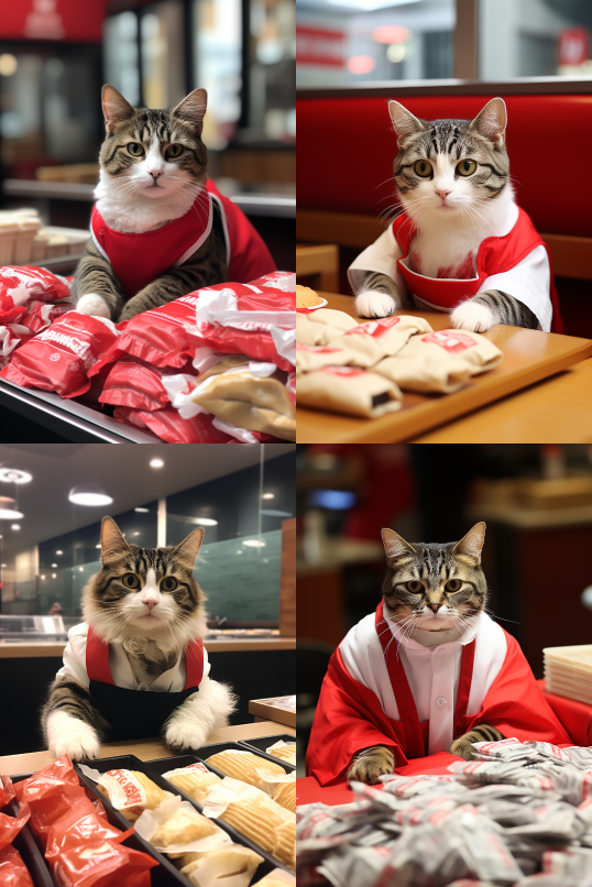 Midjourney Bot 更新时间:2023-08-30 10:22A cat eating KFC cloths, selling burgers at KFC, a cat selling burgers --ar 2:3 --style raw --v 5.2 --s 250