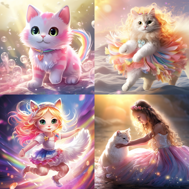 Midjourney Bot 更新时间:2023-08-30 10:23In a fantastical world, there is a cute little girl. She has a magical rainbow cat as her most loyal companion. This cat is very special, it is transparent and shimmers with white and pink light. As the little girl walks in nature, the rainbow cat jumps around like a beam of light. They traverse through colorful rainbows under the sunlight, bringing a miraculous hue to everything around them. The transparent cat emits a gentle and soft glow, as if a star hanging on the little girl's shoulder. Whenever she encounters difficulties or feels lonely, the rainbow cat radiates healing power, giving her courage and comfort. The little girl and her rainbow cat explore this magical world together, they leap on the grass, converse with flowers, and leave beautiful ripples in the lake. Everyone who has seen this wonderful duo is attracted by their beauty and innocence. Whether in dreams or in real life, the little girl and the rainbow cat are a true miracle. They bring joy, hope, and magic, turning this world into a better place. --no Trees, Buildings --ar 1:1 --style raw --v 5.2