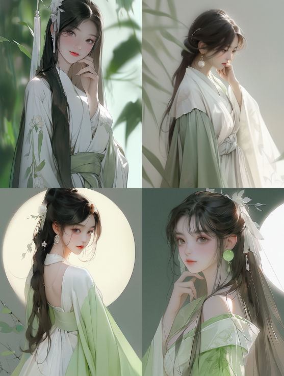Midjourney Bot 更新时间:2023-08-30 10:25Photography, soft, dark white and light green, a Chinese girl, round face, big, eyes, long hair, long Hanfu, long skirt, bright, moon, romantic dreamlike style, super detail, super quality, --s 127 --ar 3:4 --style expressive --niji 5