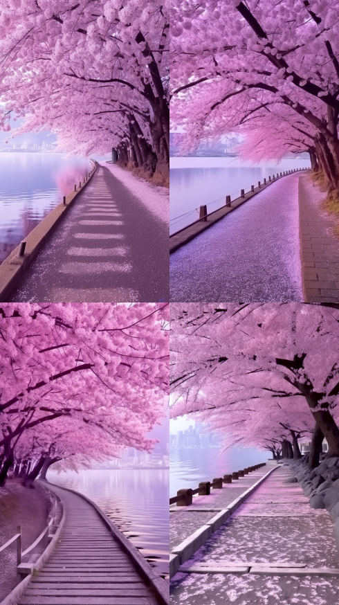 Midjourney Bot 更新时间:2023-08-30 10:27The pink lines on the footpath along the water steps have the style of animation aesthetics, purple and silver, cherry blooms, ultra high definition images and charging color landscapes --c 10 --iw 1.5 --ar 9:16 --style raw --v 5.2