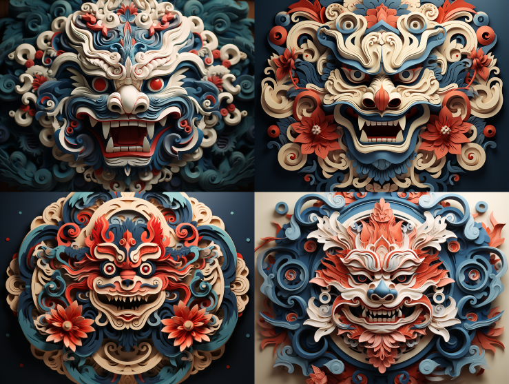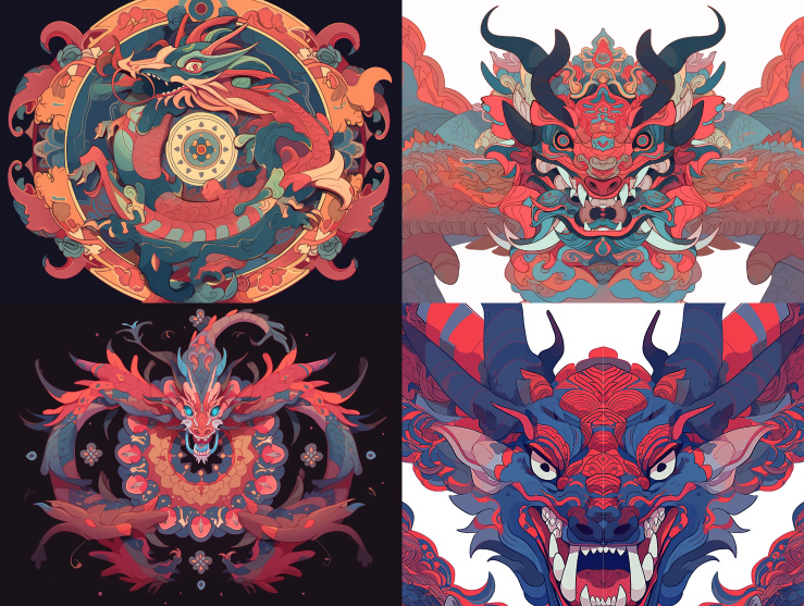 Midjourney Bot 更新时间:2023-08-30 10:09Chinese dragon, dragon pattern totem, red, blue, geometric shapes, Mandala, geometric shapes, Mandala --ar 4:3 --style expressive --niji 5