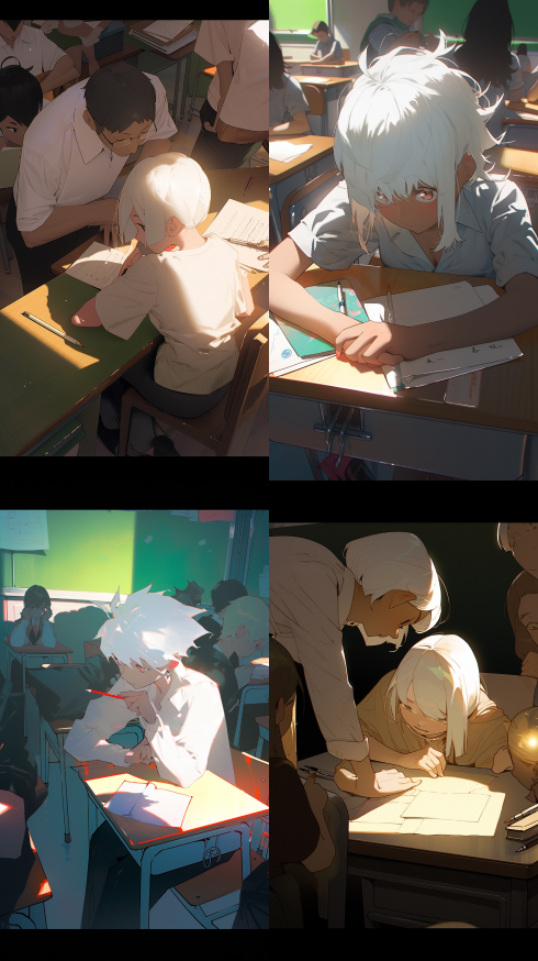 Midjourney Bot 更新时间:2023-08-30 10:03A teacher with white hair was carefully correcting the students' homework under the desk lamp --ar 9:16 --style expressive --niji 5
