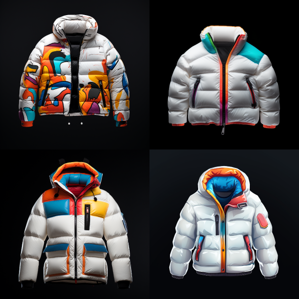 Midjourney Bot 更新时间:2023-08-30 09:53A white cartoon down jacket with colorful cuffs and collar, against a pure black background. --ar 1:1 --style raw --v 5.2