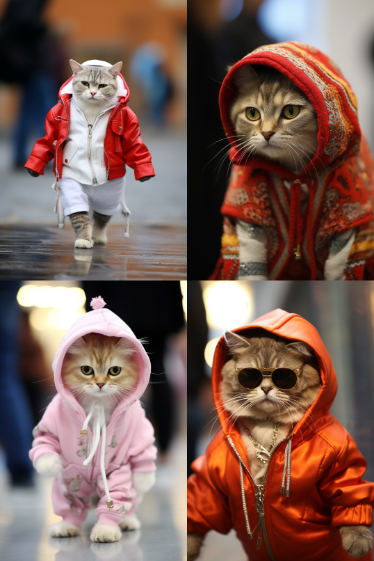 Midjourney Bot 更新时间:2023-08-30 10:03Cats wearing various fashionable clothes, walking on catwalks, fashion shows, walking cats --ar 2:3 --style raw --v 5.2