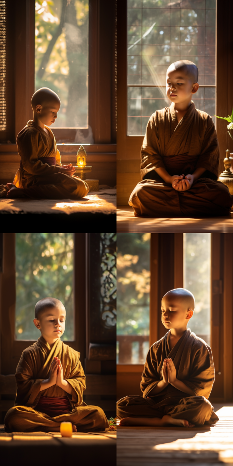 Midjourney Bot 更新时间:2023-08-30 09:58In a peaceful and ancient temple, a young little monk sits on a redwood meditation cushion. His posture is straight, with slightly bent knees and hands folded in front of his chest. Sunlight streams through the windows, illuminating his closed eyes and serene expression. The temple is filled with the fragrant scent of incense, creating a sense of tranquility and contemplation. The young monk seems completely immersed in this environment, his spirit resonating with the universe and connected to mysterious forces. Though still young, his posture and demeanor exude a wisdom and calmness that transcends time. --ar 1:2 --style raw --v 5.2