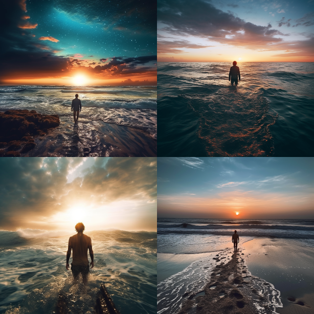 Midjourney Bot 更新时间:2023-08-30 09:55A man gradually walked towards the deep sea and turned his back towards the entire horizon of life --ar 1:1 --style raw --v 5.2