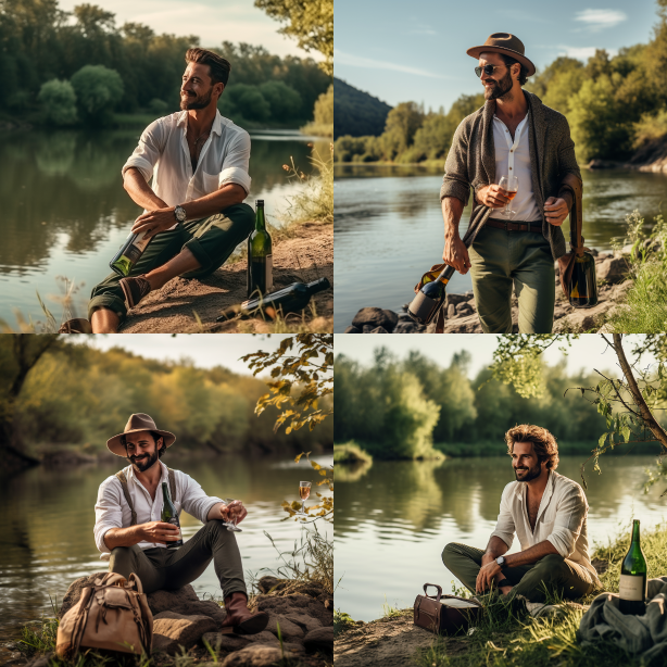 Midjourney Bot 更新时间:2023-08-30 09:44A handsome man is fishing by the river with a wine bottle in his hand --ar 1:1 --style raw --v 5.2