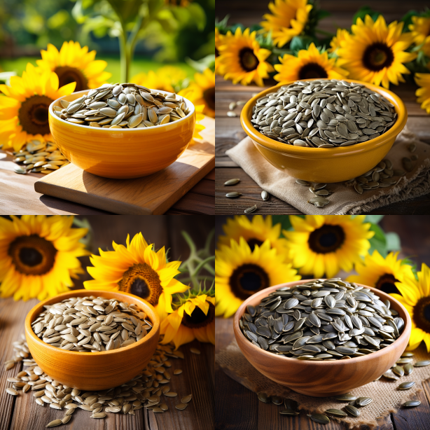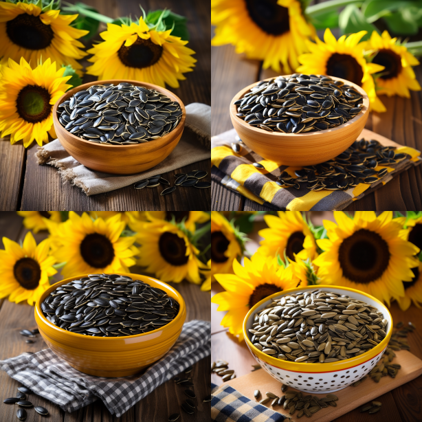 Midjourney Bot 更新时间:2023-08-30 09:45Sunflower seeds in a bowl, bowl on a wooden table. Sunflower seeds are plump and resemble melon seeds. The background is a sunflower garden. --ar 1:1 --style raw --v 5.2