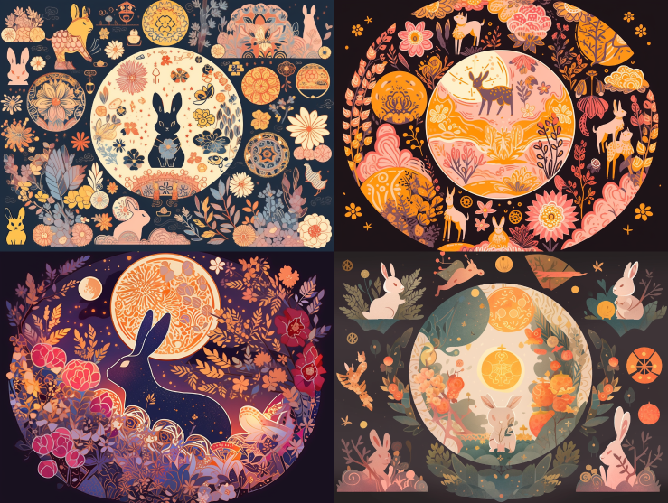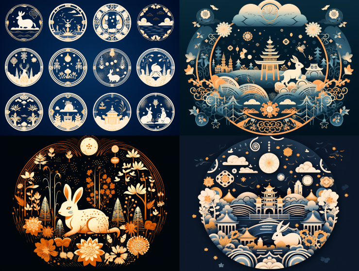 Midjourney Bot 更新时间:2023-08-30 09:46Combining a flat art style with the form of silhouettes, summarizing Mid-Autumn Festival elements such as the moon, lanterns, rabbits, osmanthus flowers, osmanthus trees, pine trees, etc. Mandala. --ar 4:3 --style raw --v 5.2