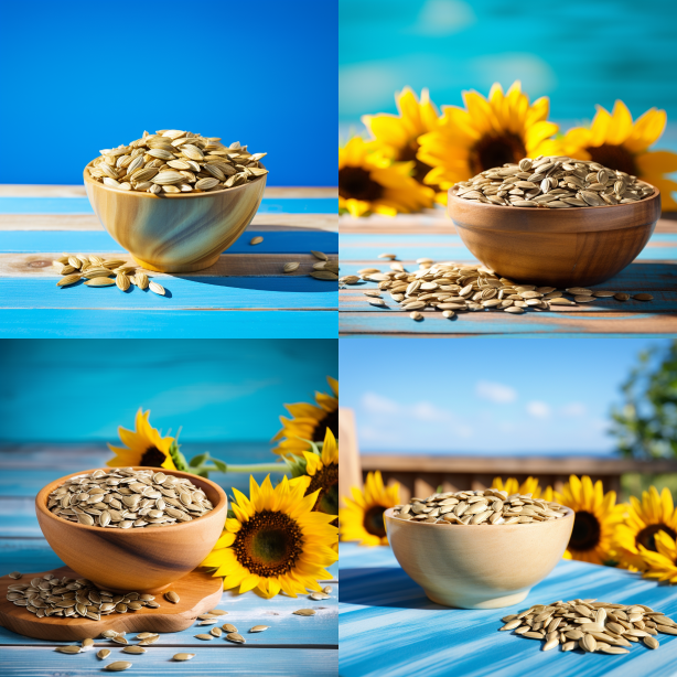 Midjourney Bot 更新时间:2023-08-30 09:25Sunflower seeds in a bowl with a sky blue background, bowl on a wooden table. Sunflower seeds are plump granular seeds resembling melon seeds. --ar 1:1 --style raw --v 5.2