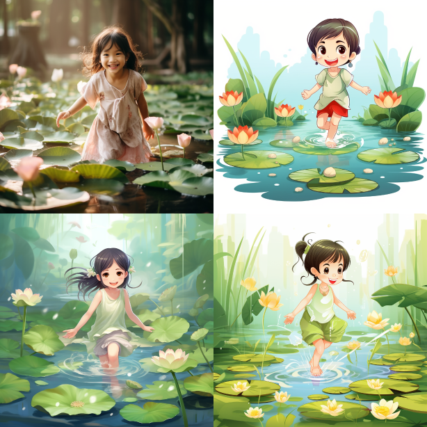 Midjourney Bot 更新时间:2023-08-30 08:23Lotus pond, a smiling girl stepping on lotus leaves. --ar 1:1 --style raw --v 5.2