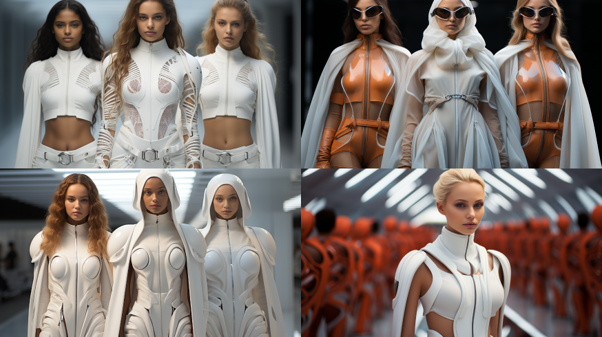 Midjourney Bot 更新时间:2023-08-30 08:58Modern, futuristic modern show, modeling wearing,Futuristic cloths in 2050 --s 584 --ar 16:9 --style raw --v 5.2