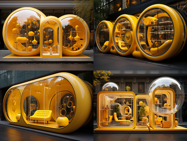 Midjourney Bot 更新时间:2023-08-30 09:00Long shot, yellow sphere, Soft,Outdoor sniffscape, pop up store, creative store,Design, futuristic concept design, Window display,Design, window display arrangement. Organizational/,ECOarchitectureNeo futurism. 8Kultra detailed,Photosensitive --s 300 --ar 4:3 --style raw --v 5.2