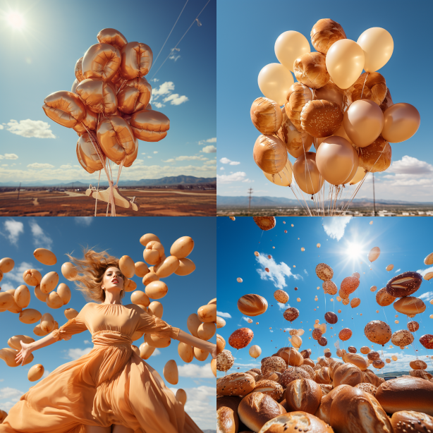 Midjourney Bot 更新时间:2023-08-30 08:03Balloons in bread shape in the sky, fashion --ar 1:1 --style raw --v 5.2 --s 250