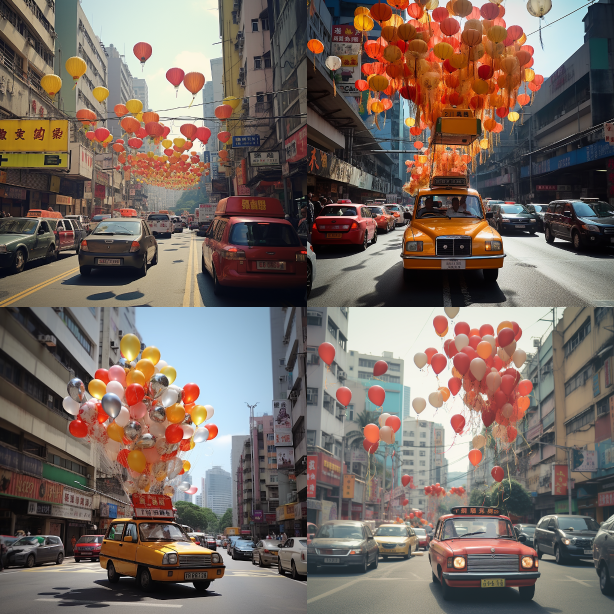 Midjourney Bot 更新时间:2023-08-30 08:02Hong Kong taxi, flying, Chinese, tradition balloon --ar 1:1 --style raw --v 5.2