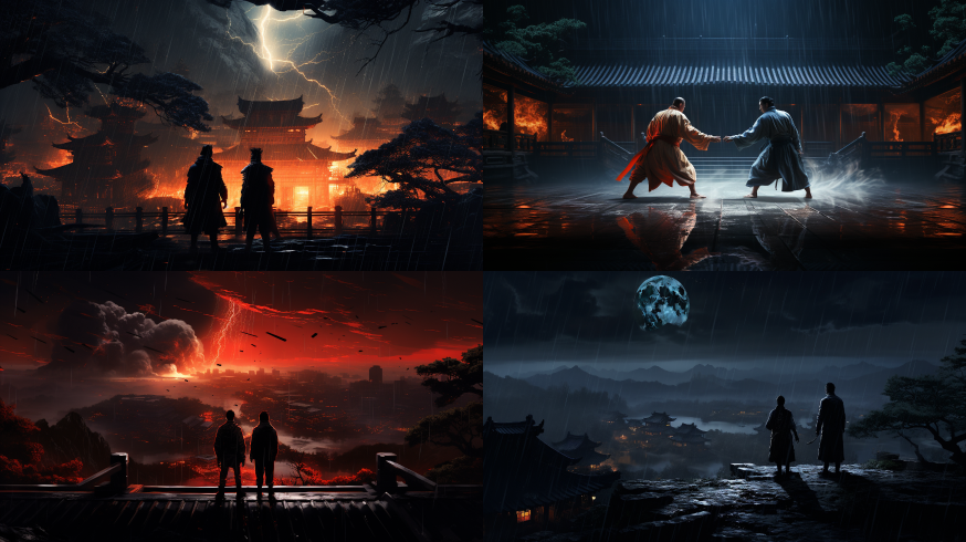 Midjourney Bot 更新时间:2023-08-30 08:55At night, big rain, illustration style, two men are lighting on a roof, Jin Yong style, Chinese,Separationscenes, Chinese ink and wash,Style, Chinese poem arts style, Chinese,Swordsmen film tale, high,Detailed, dynamic, mathematical, spinning, realistic lighting and shading, vibrant 8k, octane render, unreaean engine, very detailed, concept art, realistic, Cry engine, --s 200 --c 10 --ar 16:9 --style raw --v 5.2