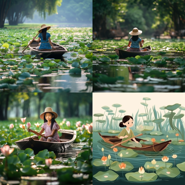 Midjourney Bot 更新时间:2023-08-30 06:52The girl rows a boat to the lotus pond to pick lotus seeds. --ar 1:1 --style raw --v 5.2
