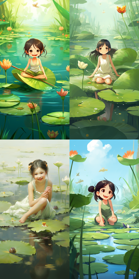Midjourney Bot 更新时间:2023-08-30 07:01Lotus pond, smiling girl, dragonfly, lotus leaf. --ar 1:2 --style raw --v 5.2