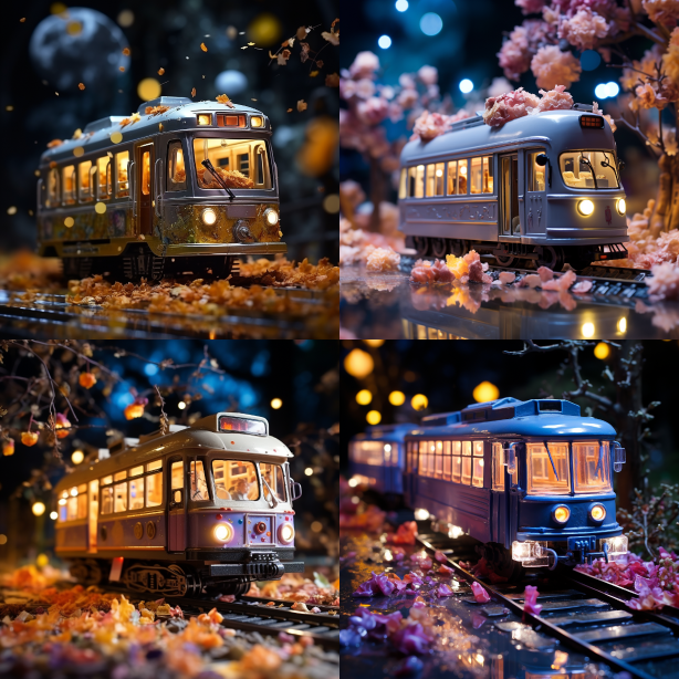 Midjourney Bot 更新时间:2023-08-30 03:50Autumn festival lands which make of plastic filled with light and look like toy tram, fashion photography, full moon sky, close up --ar 1:1 --style raw --v 5.2 --s 250
