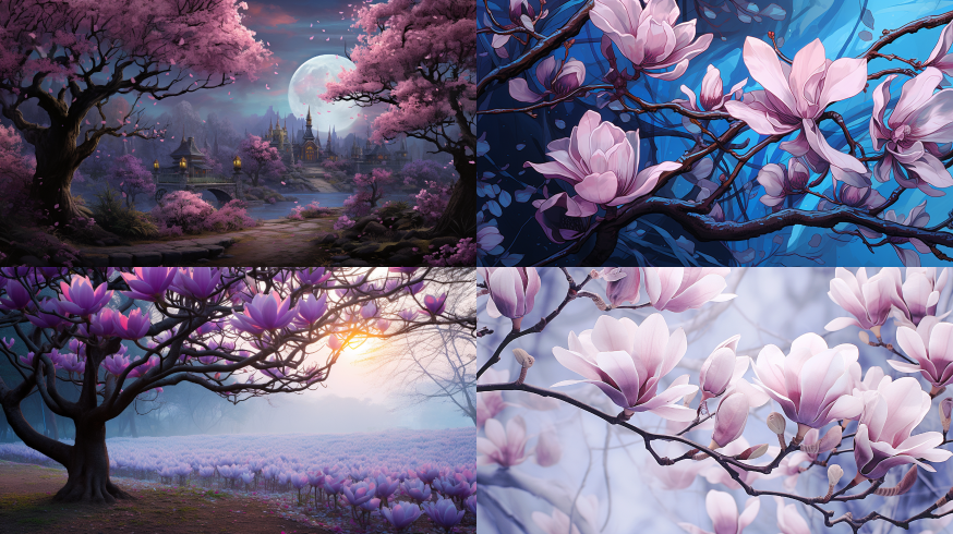 Midjourney Bot 更新时间:2023-08-30 04:17Andersen's Scenery and Fairy Tale Scenes of Blue Purple Magnolias --ar 16:9 --style raw --v 5.2