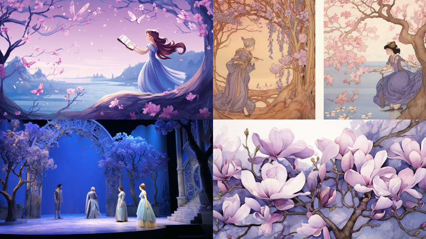Midjourney Bot 更新时间:2023-08-30 04:10The Scenes of Andersen's Fairy Tales of Blue Purple Magnolias --ar 16:9 --style raw --v 5.2