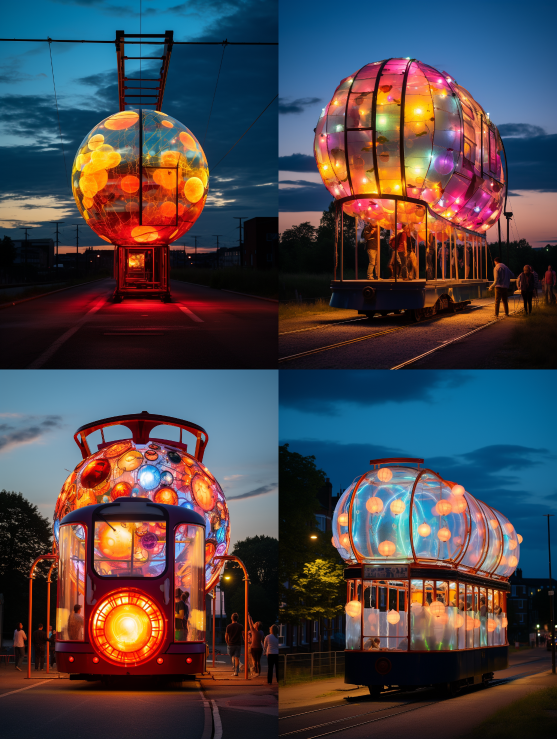Midjourney Bot 更新时间:2023-08-30 04:13Ultra hd! Lantern, Inflammable tram installations, full moon sky background, the visual contrast, vibrant inflatables, f50, 16k, art installations, --ar 3:4 --style raw --v 5.2