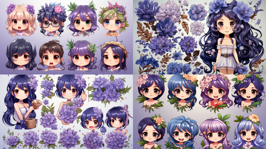 Midjourney Bot 更新时间:2023-08-30 03:59WeChat emoticon pack, magnolia, blue purple, cute Q version --ar 16:9 --style raw --v 5.2