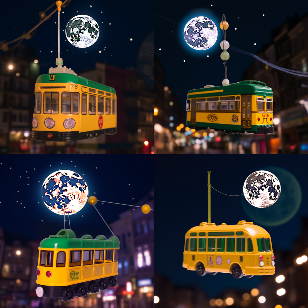 Midjourney Bot 更新时间:2023-08-30 03:49Plastic toy lands in the shape of Hong Kong tram float in front of the moon and night sky during the Mid Autumn Festival --ar 1:1 --style raw --v 5.2