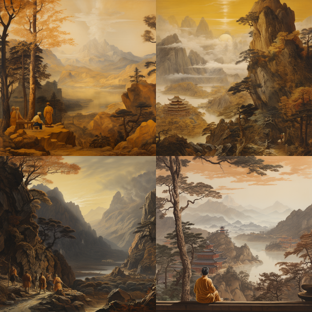 Midjourney Bot 更新时间:2023-08-29 19:19Painted a scroll of Chinese landscape in the mountains, in the style of tramp l ' œ Il illustrative detail, yellow and brown, Edward poynter, gold leaf, mysterious figures, monotonic context, romanticized reality --iw 2 --ar 1:1 --style raw --v 5.2