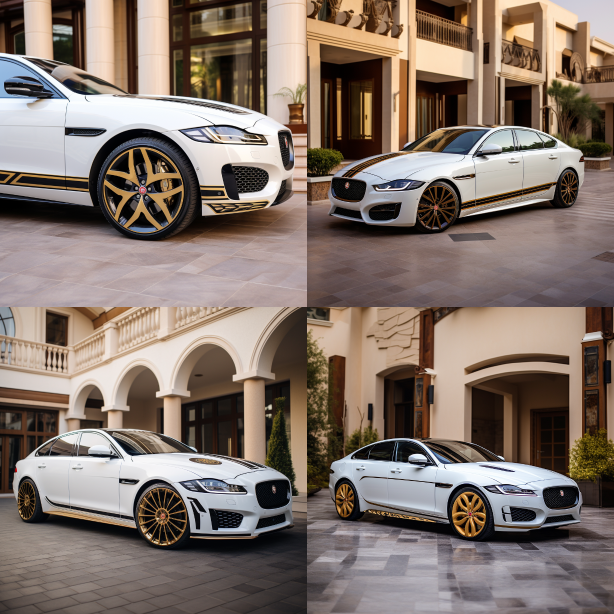 Midjourney Bot 更新时间:2023-08-29 19:19Masterpiece, high-quality, Jaguar XFL, white+gold border car stickers, gold wheels, in a luxurious villa --ar 1:1 --style raw --v 5.2