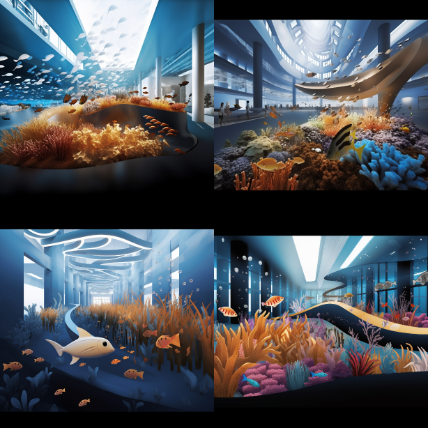 Midjourney Bot 更新时间:2023-08-29 19:35The first picture should be brighter, with a glass roof at the top. The fish tank has equipment connected to it. --ar 1:1 --v 5.2 --style raw