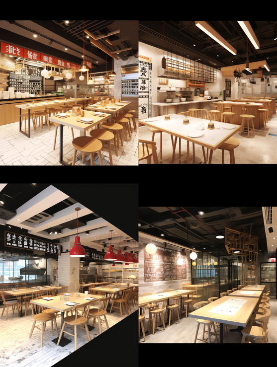 Midjourney Bot 更新时间:2023-08-29 19:20A 300 square meter steamed chicken shop, daytime, four person table, industrial suspended ceiling, ceramic tile floor, modern style --seed 4 --ar 3:4 --style raw --v 5.2