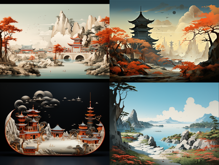 Midjourney Bot 更新时间:2023-08-29 15:23An Ancient Landscape painting, sections a,Poetic, invisible Chinese architecture, and the,Prospect is a Chinese towel In the foreground,Of the long scroll, the buildings are highlighted,In gold Except for small areas embedded with red, no other mixed color builds have been added Against a matte black,Background Trees and employees adult,Seven, --c 33 --iw 0.5 --ar 4:3 --style raw --v 5.2