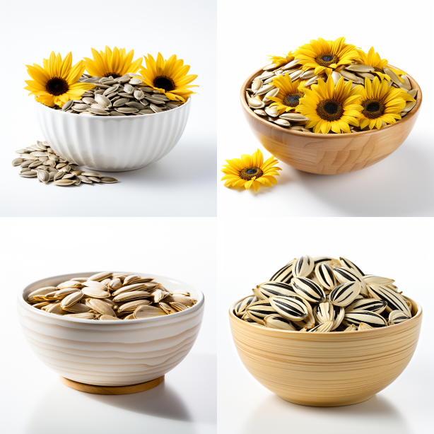 Midjourney Bot 更新时间:2023-08-29 14:46Sunflower seeds, in a bowl, front view, white background image. The sunflowers should be larger. --ar 1:1 --style raw --v 5.2 --s 250