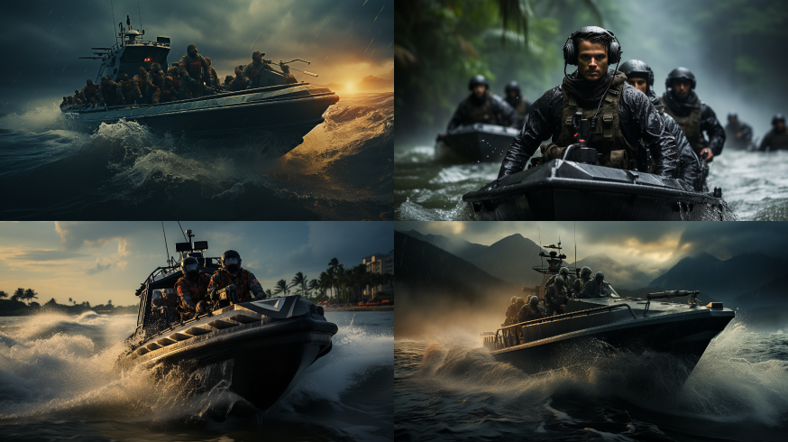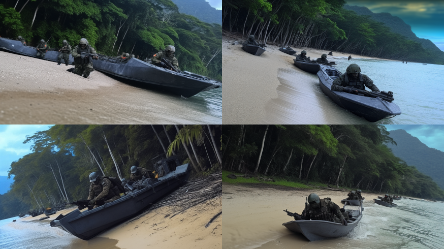 Midjourney Bot 更新时间:2023-08-29 14:51Tentera laut Diraja Malaysia, Navy Special forces landing, beaching, navy, weapons, complex weather, ocean background, speedboats, waves beating on the beach, and the sky is covered with dark clouds. Navy speedboat on the sea. Navy Special forces armed with various weapons, fighting. The speedboat approached the shore, and the special forces quickly jumped off and charged the enemy's formation. Cinematic --weird 30 --s 750 --c 20 --ar 16:9 --style raw --v 5.2