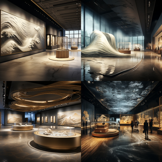 Midjourney Bot 更新时间:2023-08-29 14:51Museum at chengdu municipal exhibition hall c&v image courses, in the style of realistic depiction of light, primary scenes, innovative page design, dark gray and light gold, literary exhibitions, natural ocean waves --ar 1:1 --style raw --v 5.2 --s 250