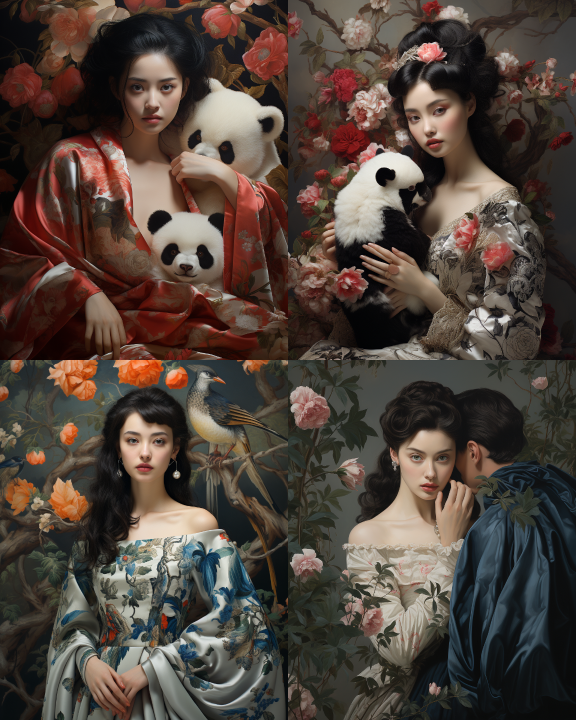 Midjourney Bot 更新时间:2023-08-29 14:54Secret of love cover art by Harry Mannequin, classic Chinese beauty, in the style of contemporary Chinese art, Fashion photography, flat illustration, minimalist, baroque primary, romantic landscape, native realism, past scenes, super detailed, detailed, dense compositions, long shot,Panda,supermodel,documentary photography,fullbody shot,HDR --ar 4:5 --style raw --v 5.2 --s 250