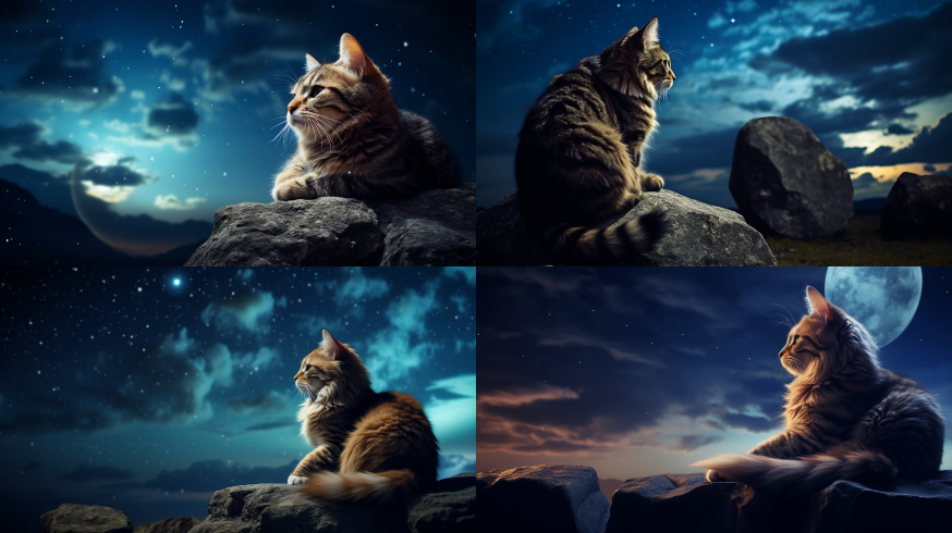 Midjourney Bot 更新时间:2023-08-29 14:54Under the moonlight at night, a cat sat on a large stone, looking at the sky and thinking about life --ar 16:9 --style raw --v 5.2